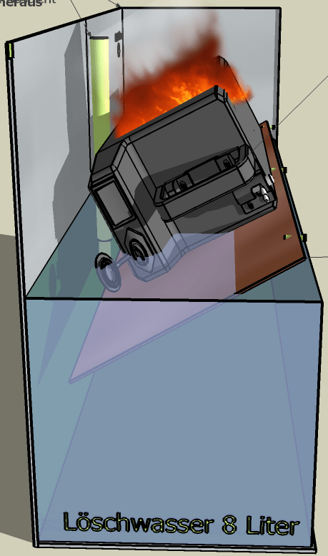 - Erreicht das innere der Box >60 Grad , liegt innerhalb des Akkugehäuses die Temperatur viel höher, einzelne Zellen sind schon am entzünden, der Akku ist hier bereits nicht mehr zu retten und hat sich in eine gefährliche Brandbombe verwandelt. Um einen „Thermal runnaway“ zu verhindern, muss der Akku sofort vollständig mit Wasser geflutet werden, um die Explosion einzelner Zellen in einer eine Kettenreaktion zu verhindern!! (siehe Akkubrand). Die Aufhängung des Akkus besteht aus einer Schmelzsicherung, dieser löst bei >60 Grad aus und versenkt bei beginnendem Akkubrand den Akku sofort im Löschwasser — Der Akkubrand wird in einem frühen Stadium verhindert, die Zellen gekühlt.