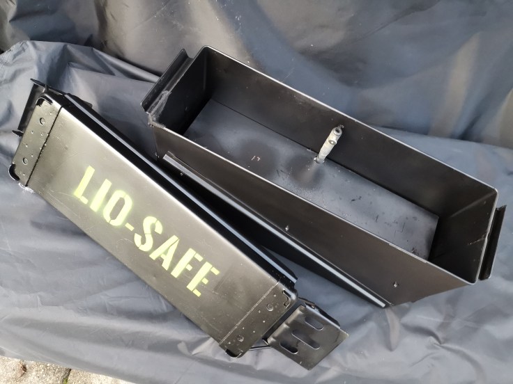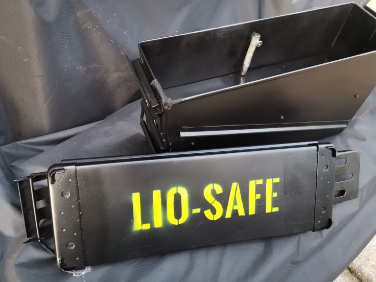Stabile Stahl-Munitionskiste wird aufbereitet und wiederverwendet (Nachhaltigkeit!), und bietet optimalen Schutz vor Ausbreitung des Brandes ! Nur der Akku wird in der Box auch dauerhaft gelagert und geladen, das Ladegerät bleibt ausserhalb.